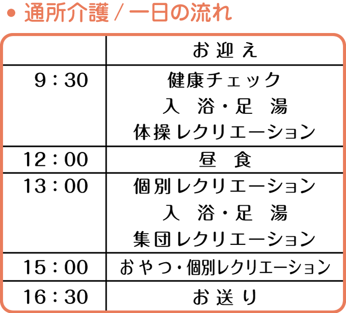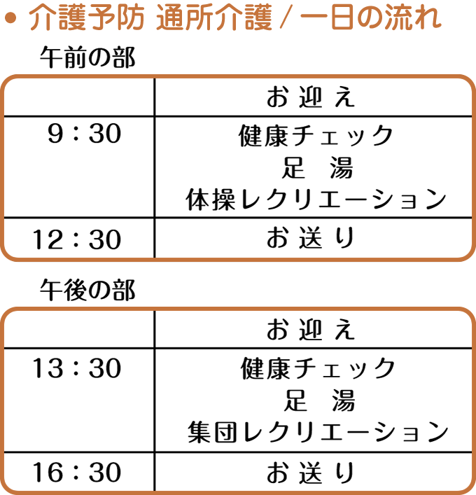 ご利用者の方が笑って楽しく過ごして頂けるようなレクリエーション、身体を温める足湯・挽きたての美味しいコーヒーなどご用意して職員一同お待ちしております。また、筋力の維持や体力の向上など目指した楽しい体操などもいたします。ご一緒に楽しい時間を過ごしましょう!